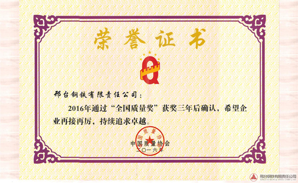 邢鋼于2013年獲得全國(guó)質(zhì)量獎(jiǎng),獲獎(jiǎng)后邢鋼繼續(xù)實(shí)踐《卓越績(jī)效評(píng)價(jià)準(zhǔn)則》,深入推進(jìn)卓越績(jī)效管理模式,持續(xù)改進(jìn),不斷追求卓越。2016年9月全國(guó)質(zhì)量獎(jiǎng)評(píng)審活動(dòng)領(lǐng)導(dǎo)小組組織專家對(duì)邢鋼進(jìn)行了全國(guó)質(zhì)量獎(jiǎng)獲獎(jiǎng)三年后的現(xiàn)場(chǎng)確認(rèn),通過(guò)專家小組的現(xiàn)場(chǎng)提問(wèn)、材料匯報(bào)、生產(chǎn)現(xiàn)場(chǎng)的參觀,邢鋼順利通過(guò)了“全國(guó)質(zhì)量獎(jiǎng)”獲獎(jiǎng)三年后確認(rèn)并頒發(fā)證書。