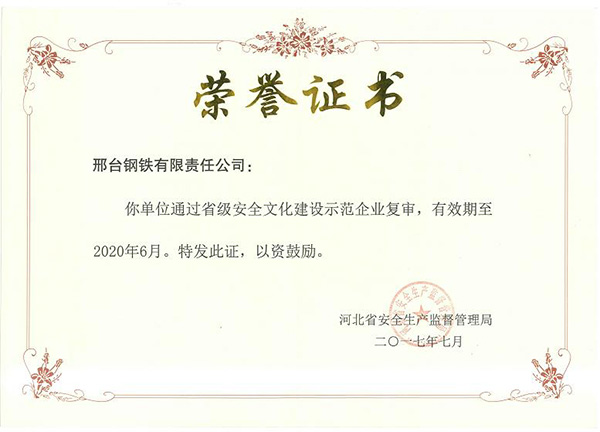 2014年,邢鋼安全文化建設(shè)取得初步成果,首批獲得“省級(jí)安全文化建設(shè)示范企業(yè)”。2017年7月,邢鋼順利通過(guò)復(fù)審再獲“省級(jí)安全文化建設(shè)示范企業(yè)”。
