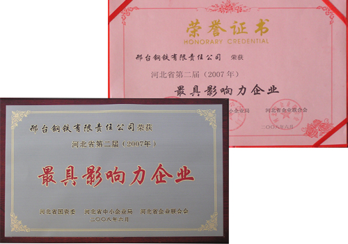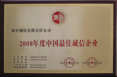 2008年12月,邢鋼榮獲由中國(guó)企業(yè)聯(lián)合會(huì)、中國(guó)企業(yè)家協(xié)會(huì)頒發(fā)的2008年度“中國(guó)最佳誠(chéng)信企業(yè)”榮譽(yù)稱(chēng)號(hào)。