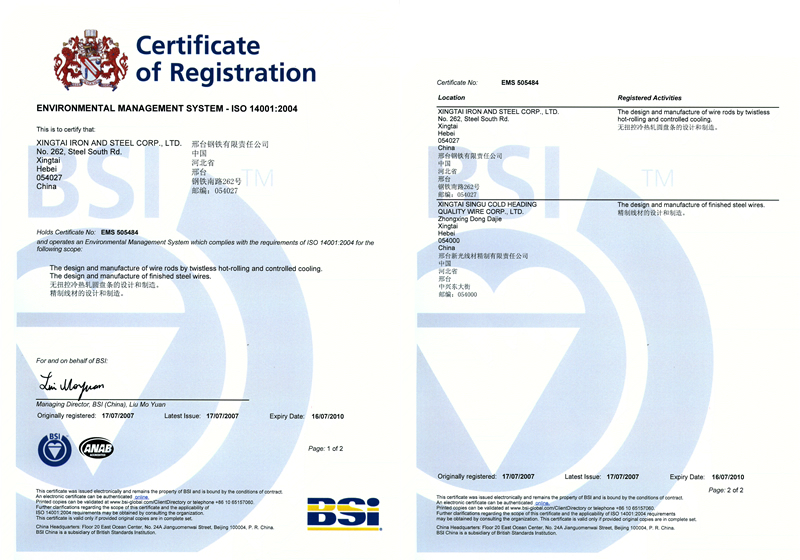 2007年7月17日,邢鋼獲ISO 14001:2004認(rèn)證證書(shū)(環(huán)境管理體系要求及使用指南)。