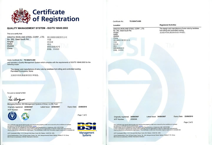 2007年8月24日,邢鋼獲ISO/TS 16949:2002認(rèn)證證書(shū)(國(guó)際汽車行業(yè)質(zhì)量管理體系認(rèn)證)。