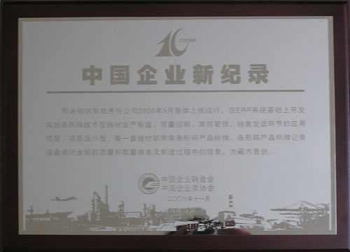 2006年11月,邢臺(tái)鋼鐵有限責(zé)任公司2005年整體上線運(yùn)行,在ERP系統(tǒng)基礎(chǔ)上開(kāi)發(fā)實(shí)施條行碼技術(shù)在線材生產(chǎn)制造、質(zhì)量控制、庫(kù)存管理、銷(xiāo)售發(fā)運(yùn)環(huán)節(jié)的應(yīng)用項(xiàng)目,項(xiàng)目運(yùn)行后每一條線材都帶有條型碼產(chǎn)品標(biāo)牌,條型碼產(chǎn)品標(biāo)牌記錄該盤(pán)線材全部的質(zhì)量和數(shù)量信息及制造過(guò)程中的信息,為國(guó)內(nèi)首創(chuàng)。
