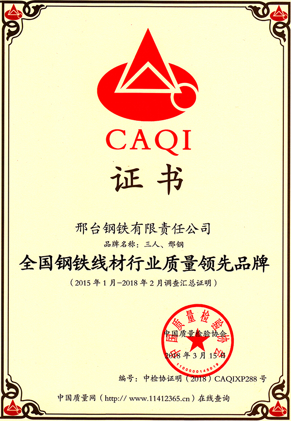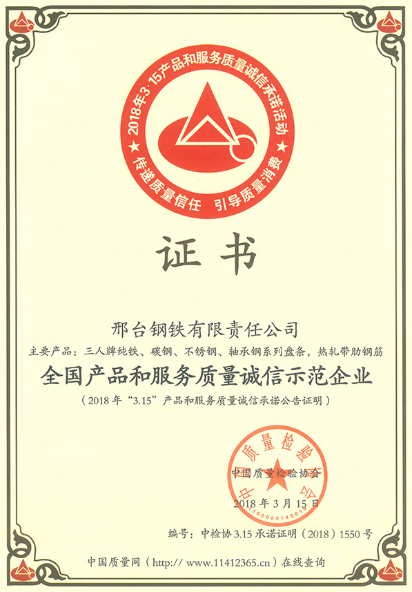 2018年3月15日,邢鋼(主要產(chǎn)品:三人牌純鐵、碳鋼、不銹鋼、軸承鋼系列盤條和熱軋帶肋鋼筋),被中國質(zhì)量檢驗協(xié)會授予“全國產(chǎn)品和服務質(zhì)量誠信示范企業(yè)”稱號。