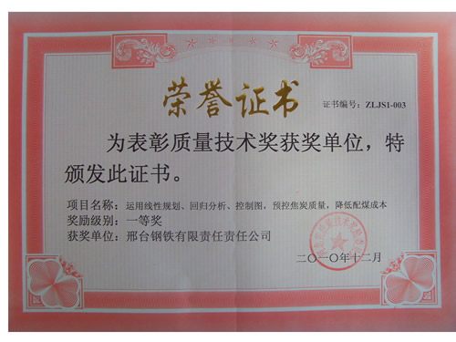 - 近日獲悉,我公司申報(bào)的“運(yùn)用線性規(guī)劃、回歸分析、控制圖預(yù)控焦炭質(zhì)量,降低配煤成本”質(zhì)量技術(shù)成果,經(jīng)河北省質(zhì)量技術(shù)獎(jiǎng)勵(lì)委員會(huì)評(píng)選,獲得一等獎(jiǎng)。該項(xiàng)目是焦化廠運(yùn)用質(zhì)量統(tǒng)計(jì)技術(shù)工具經(jīng)過實(shí)踐取得的一項(xiàng)質(zhì)量技術(shù)成果。通過實(shí)施該項(xiàng)目,配合煤成本比2008年降低了4775萬元,保持了焦炭質(zhì)量的持續(xù)穩(wěn)定。