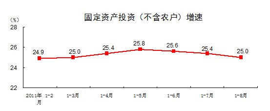 2011年1-8月份,固定資產(chǎn)投資(不含農(nóng)戶)180608億元,同比增長25%,比1-7月份回落0.4個(gè)百分點(diǎn)。其中,國有及國有控股投資62422億元,增長12.1%。從環(huán)比看,8月份固定資產(chǎn)投資(不含農(nóng)戶)增長1.16%。