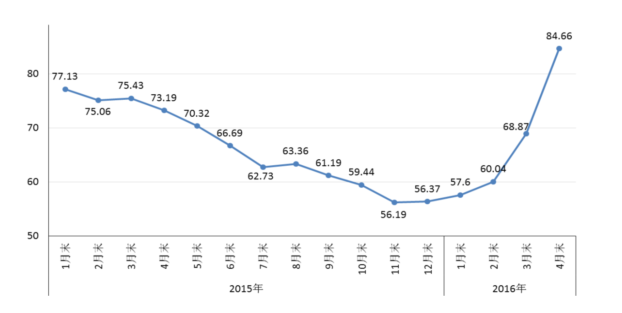 4月末,鋼鐵協(xié)會(huì)CSPI中國鋼材價(jià)格指數(shù)為84.66點(diǎn),環(huán)比上升15.79點(diǎn),升幅為22.93%,較上月加大8.22個(gè)百分點(diǎn),連續(xù)5個(gè)月環(huán)比上升;同比上升11.47點(diǎn),升幅為15.67%。(見下圖)