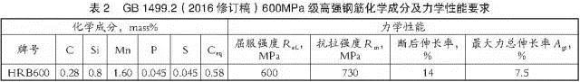 目前國內(nèi)有沙鋼、承鋼和濟鋼等鋼廠具備成功生產(chǎn)600MPa級熱軋螺紋鋼筋的經(jīng)驗。表2為GB l499.2(2016修訂稿)對600MPa級高強鋼筋HRB600化學(xué)成分和力學(xué)性能的要求。