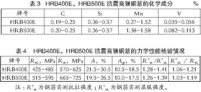 我國在GB 1499.2-2007標(biāo)準(zhǔn)中首次將鋼筋的抗震性能指標(biāo)納入國標(biāo)中,并規(guī)定了抗震鋼筋的三個代表性指標(biāo):強屈比(R?m /R?eL)、超屈比(R?eL/ReL)和最大力總伸長率(Agt)。國內(nèi)某鋼廠HRB400E、HRB500E抗震鋼筋多樣品檢驗獲得的化學(xué)成分和力學(xué)性能指標(biāo)見表3和表4。