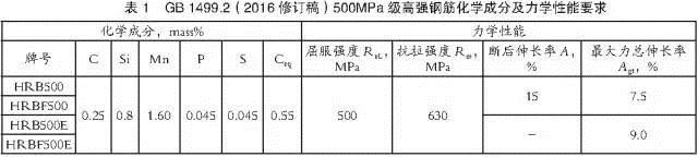 GB l499.2(2016修訂稿)規(guī)定HRB500的化學(xué)成分和碳當(dāng)量應(yīng)符合表1的要求,并根據(jù)需要鋼中還可以加入釩、鈮、鈦等元素。