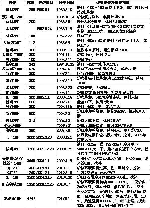 以下針對(duì)國(guó)內(nèi)外典型高爐爐缸燒出案例進(jìn)行統(tǒng)計(jì),并對(duì)燒出原因、修復(fù)和維護(hù)等方面進(jìn)行詳細(xì)的說(shuō)明,為國(guó)內(nèi)外高爐的長(zhǎng)壽提供技術(shù)和數(shù)據(jù)參考。