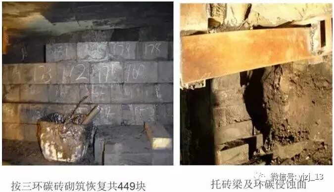利用工程剩余的UCAR炭磚重新砌筑,部分炭磚需要現(xiàn)場(chǎng)加工外型,縫隙采用炭質(zhì)泥漿??傆?jì)砌筑11層,449塊炭磚。