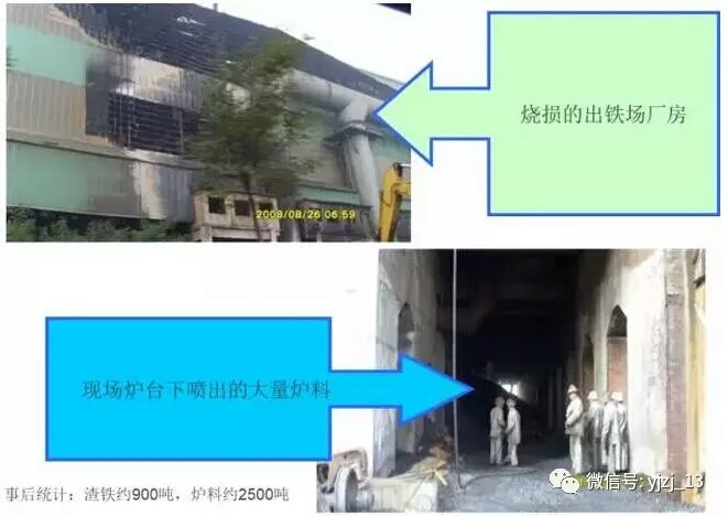 事后確認(rèn):4#鐵口下方爐缸燒穿,大量渣鐵和炙熱的爐料(焦炭、礦石)噴出,現(xiàn)場(chǎng)燒損嚴(yán)重(新3高爐本體電纜、煤粉噴吹總線電纜、新2高爐電源電纜、計(jì)量?jī)x表電纜、出鐵場(chǎng)天棚、4#爐前炮、開(kāi)口機(jī)、東場(chǎng)及北場(chǎng)爐前吊車、爐前休息室、電梯等燒損。)
