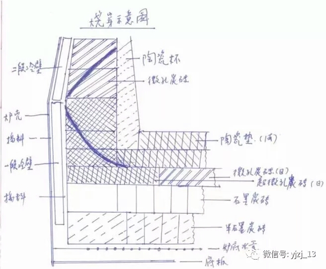 7.燒穿處炭磚原厚度為1104mm,搗料厚度60mm。