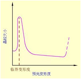 (2)預先變形度 變形度的影響主要與金屬變形的均勻度有關。變形越不均勻, 再結(jié)晶退火后的晶粒越大。變形度很小時,因不足以引起再結(jié)晶,晶粒不變。當變形度達到2~10%時,金屬中少數(shù)晶粒變形,變形分布很不均勻,所以再結(jié)晶時生成的晶核少,晶粒大小相差極大,非常有利于晶粒發(fā)生吞并過程而很快長大,結(jié)果得到極粗大的晶粒。使晶粒發(fā)生異常長大的變形度稱作臨界變形度。生產(chǎn)上應盡量避免在臨界變形度范圍內(nèi)的塑性變形加工。超過臨界變形度之后,隨變形度的增大,晶粒的變形更加強烈和均勻,再結(jié)晶核心越來越多,因此再結(jié)晶后的晶粒越來越細小。但是當變形度過大(約≥90%)時, 晶??赡茉俅纬霈F(xiàn)異常長大,一般認為它是由形變織構(gòu)造成的。