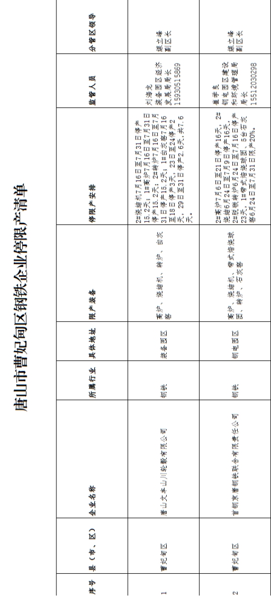 按照唐山市人民政府辦公室《關(guān)于做好全市鋼鐵企業(yè)停限產(chǎn)工作的通知》要求,結(jié)合我區(qū)(豐南區(qū),下同)實(shí)際情況,制定了我區(qū)鋼鐵企業(yè)停限產(chǎn)清單,其中縱橫鋼鐵限產(chǎn)20%,其他鋼鐵企業(yè)限產(chǎn)比例不低于50%,現(xiàn)公示如下: