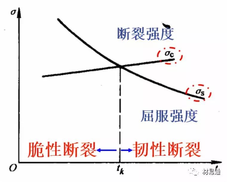 低溫脆性是材料屈服強(qiáng)度隨著溫度的降低急劇增加的結(jié)果;見(jiàn)右圖,屈服點(diǎn)隨著溫度的下降而升高,但材料的斷裂強(qiáng)度隨著溫度的變化很??;兩線交點(diǎn)對(duì)應(yīng)的溫度就是tk。