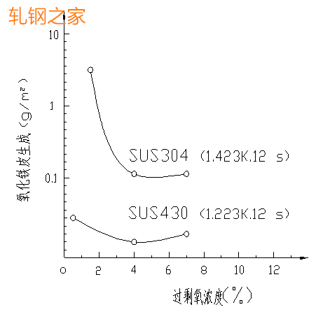 圖2:過剩氧濃度對氧化鐵皮生成量的影響