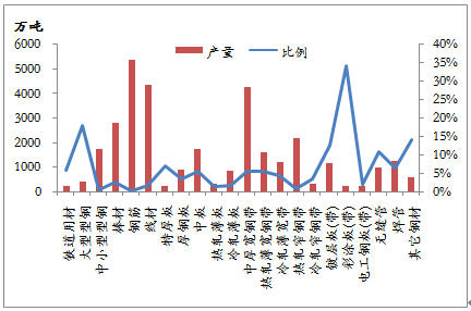1-5月份,我國(guó)共出口鋼材1791.7萬(wàn)噸,棒線材、角型材、板材、鋼管、鐵道用材和其它用材分別占11.4%、5.9%、60.1%、15.4%、1.0%和6.2%,板材所占份額最大,棒線材和鋼管次之。就前5個(gè)月出口量而言,退稅取消的鋼材品種出口數(shù)量為703.3萬(wàn)噸,占1-5月份鋼材出口總量的39.3%。雖然鋼材總出口量只占到國(guó)內(nèi)產(chǎn)量的5.1%,但仍有部分品種出口占產(chǎn)量的比例較大,對(duì)出口具有一定依賴性。鍍鋅板、熱軋板卷、中厚板和大型型鋼的出口數(shù)量占產(chǎn)量的比例較大,在出口稅率下調(diào)的情況下,國(guó)內(nèi)資源供應(yīng)的壓力將會(huì)明顯增大,從而影響到國(guó)內(nèi)價(jià)格的運(yùn)行。不過(guò),在政策執(zhí)行日期之前,出口企業(yè)必定要加緊落實(shí)前期簽訂的合同,熱軋卷等品種的出口可能會(huì)加大,對(duì)國(guó)內(nèi)鋼材市場(chǎng)將是利好。
