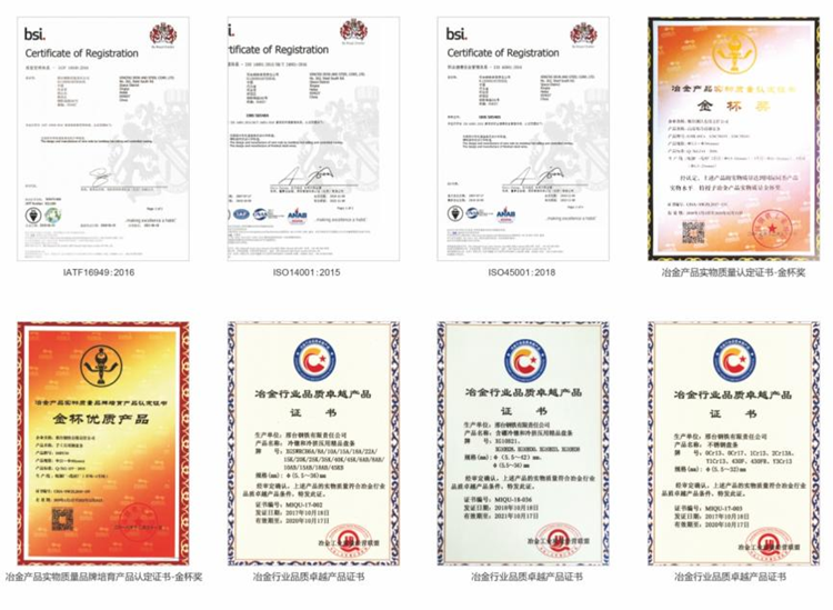 1999年邢鋼開始推行質(zhì)量管理體系,成為最早一批通GB/T19000族標(biāo)準(zhǔn)過認(rèn)證的鋼企之一。2006年,作為全國首批鋼鐵企業(yè),邢鋼全流程通過了英標(biāo)認(rèn)證公司TS16949汽車行業(yè)質(zhì)量管理體系。產(chǎn)品研發(fā)也是芝麻開花節(jié)節(jié)高,通過創(chuàng)新研發(fā)模式相繼開發(fā)了汽車用鋼、鐵路用鋼,高強(qiáng)橋梁用鋼,耐候鋼、重熔鋼等產(chǎn)品,涵蓋冷鐓鋼、彈簧鋼、軸承鋼、純鐵、預(yù)應(yīng)力鋼、易切削鋼、工模具鋼、耐候鋼等十八大系列。如今的邢鋼已經(jīng)通過EMS,OHSMS等9個體系認(rèn)證!