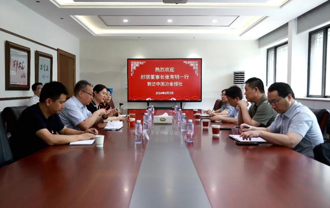 6月5日下午,邢臺鋼鐵有限責任公司董事長張育明一行到訪中國冶金報社,中國鋼鐵工業(yè)協(xié)會副秘書長,中國冶金報社黨委書記、社長范鐵軍熱情歡迎張育明一行的到來,雙方進行了座談交流。
