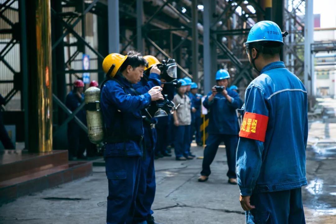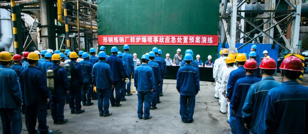 隨后,參會(huì)人員一起現(xiàn)場(chǎng)觀摩了邢鋼高溫熔融金屬爆噴事故現(xiàn)場(chǎng)應(yīng)急處置演練。本次演練,模擬煉鋼廠加料跨天車向2#轉(zhuǎn)爐加廢鋼時(shí)發(fā)生爆噴為背景,演示了事故上報(bào)、安全疏散、預(yù)案啟動(dòng)、現(xiàn)場(chǎng)搶險(xiǎn)、應(yīng)急救援等環(huán)節(jié)。