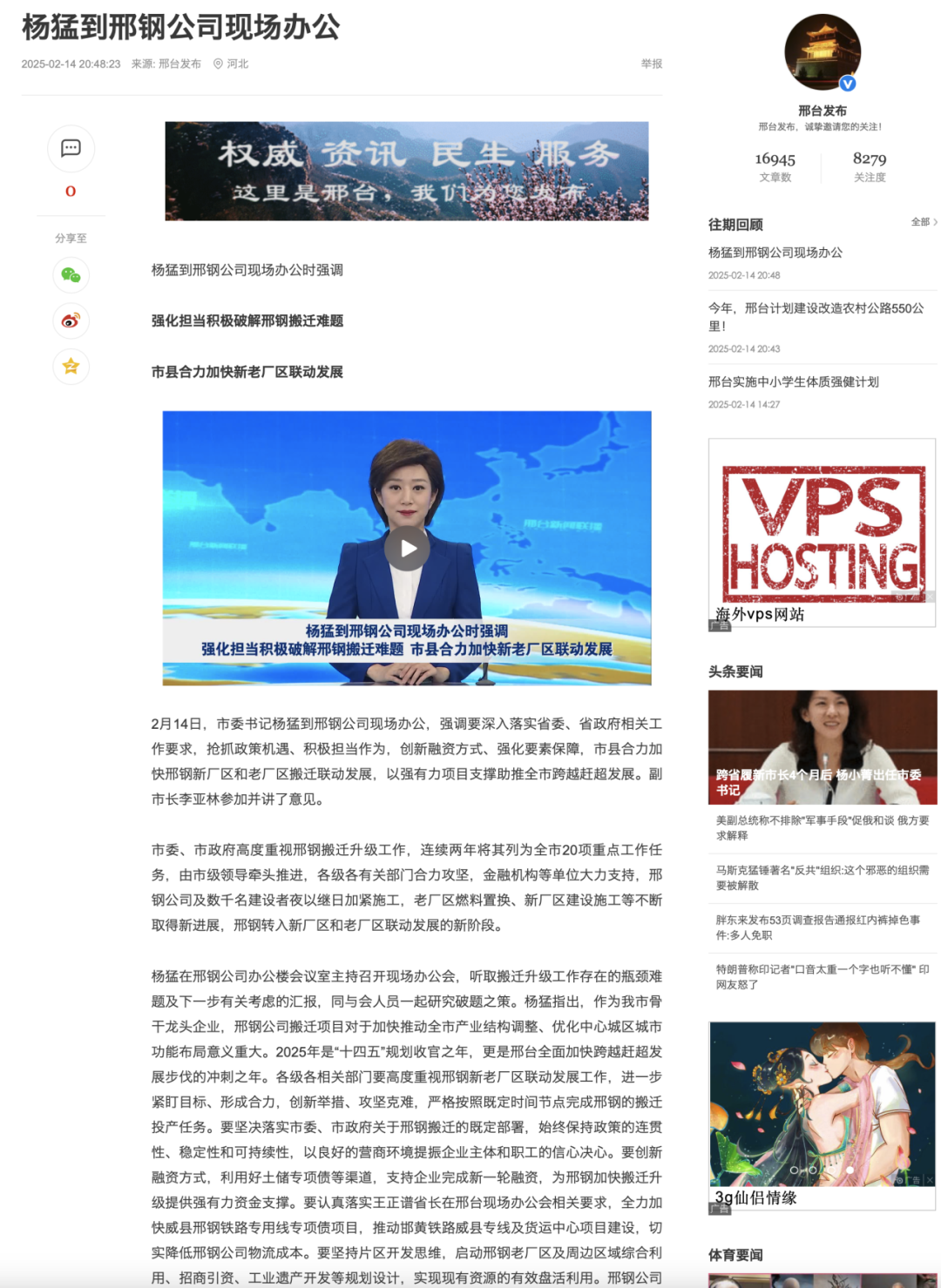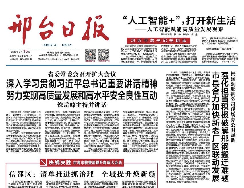 2月14日,市委書記楊猛到邢鋼公司現(xiàn)場辦公,強(qiáng)調(diào)要深入落實(shí)省委、省政府相關(guān)工作要求,搶抓政策機(jī)遇、積極擔(dān)當(dāng)作為,創(chuàng)新融資方式、強(qiáng)化要素保障,市縣合力加快邢鋼新廠區(qū)和老廠區(qū)搬遷聯(lián)動(dòng)發(fā)展,以強(qiáng)有力項(xiàng)目支撐助推全市跨越趕超發(fā)展。副市長李亞林參加并講了意見。