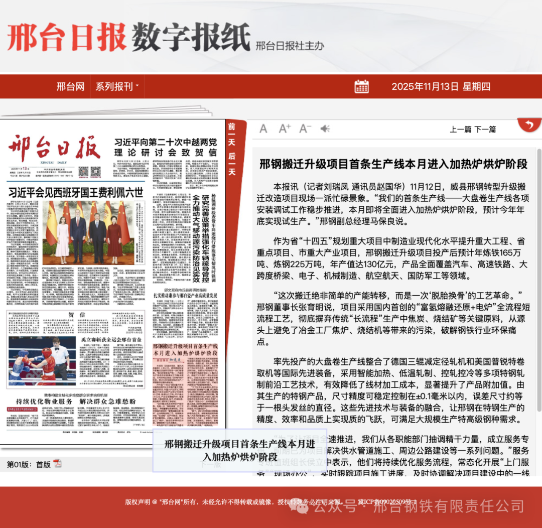 率先投產(chǎn)的大盤卷生產(chǎn)線整合了德國三輥減定徑軋機和美國普銳特卷取機等國際先進裝備,采用智能加熱、低溫軋制、控軋控冷等多項特鋼軋制前沿工藝技術(shù),有效降低了線材加工成本,顯著提升了產(chǎn)品附加值。由其生產(chǎn)的特鋼產(chǎn)品,尺寸精度可穩(wěn)定控制在±0.1毫米以內(nèi),誤差尺寸約等于一根頭發(fā)絲的直徑。這些先進技術(shù)與裝備的融合,讓邢鋼在特鋼生產(chǎn)的精度、效率和品質(zhì)上實現(xiàn)質(zhì)的飛躍,可滿足大規(guī)模生產(chǎn)特高級鋼種需求。“為了讓項目全速推進,我們從各職能部門抽調(diào)精干力量,成立服務(wù)專班,前期已為項目解決供水管道施工、周邊公路建設(shè)等一系列問題。”服務(wù)專班值班組長侯立中表示,他們將持續(xù)優(yōu)化服務(wù)流程,常態(tài)化開展“上門服務(wù)”“現(xiàn)場辦公”,實時跟蹤項目施工進度,及時協(xié)調(diào)解決項目建設(shè)中的一線難題,保障項目按時間節(jié)點高效推進,早日建成投產(chǎn)。“眼下,我們正對標國內(nèi)首鋼智新等先進企業(yè),瞄準高強度耐熱鋼等八大系列的高精尖產(chǎn)品,加大科技研發(fā)投入力度,全面提升產(chǎn)品附加值,實現(xiàn)高端化、綠色化、智能化升級,為我國高端裝備制造業(yè)提供關(guān)鍵材料支撐。”馬保良說。